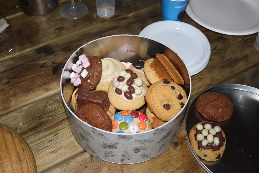 El refugio está abierto, hay una mesa grande y leña seca para hacer un fuego que no tardamos en encender. Esta gran familia ha traído fabada Litoral para todos, filetes de pollo, ensaladilla y diversos aperitivos, todo ello regado con alguna cervecita y un vino blanco afrutado que entra fenomenal. Comimos muy bien y en un ambiente extraordinario. Para finalizar, unas exquisitas, enormes y muy decoradas cookies cocinadas con mucho cariño el día anterior por las sobrinas Calzada y una tarta Sacher sobre la que Clara sopló las velas y escuchó de nuevo la triste canción de Cumpleaños Feliz.