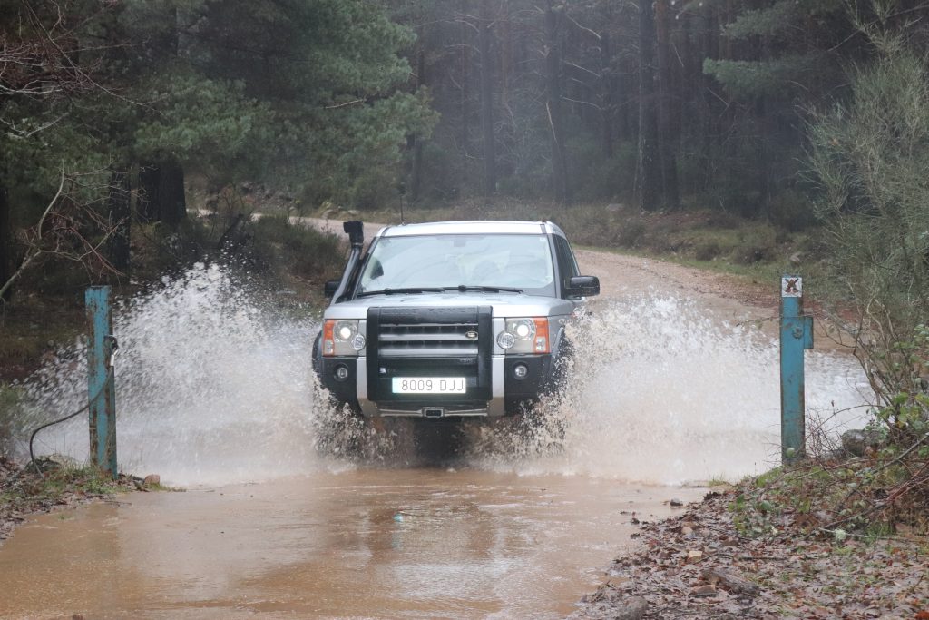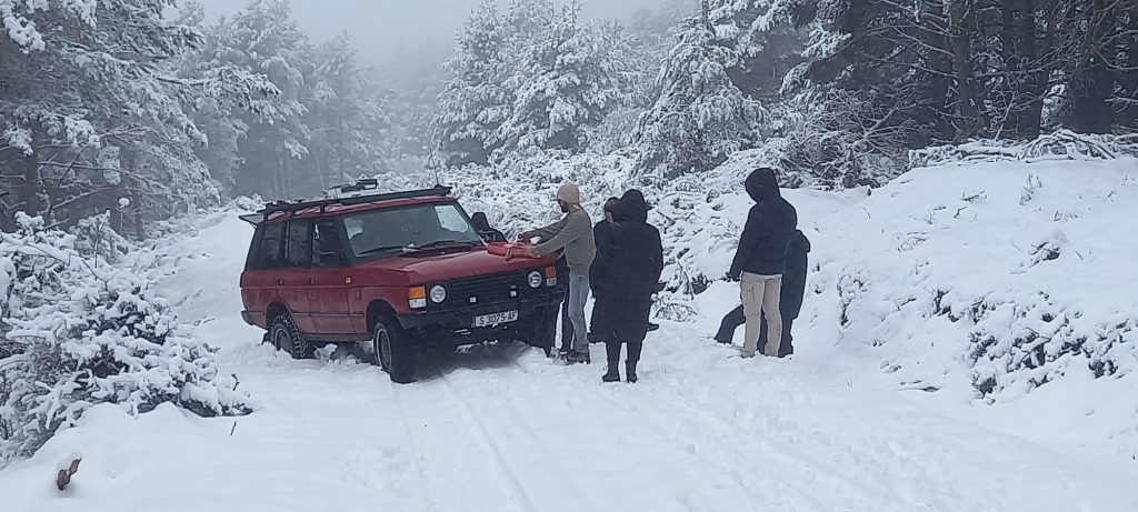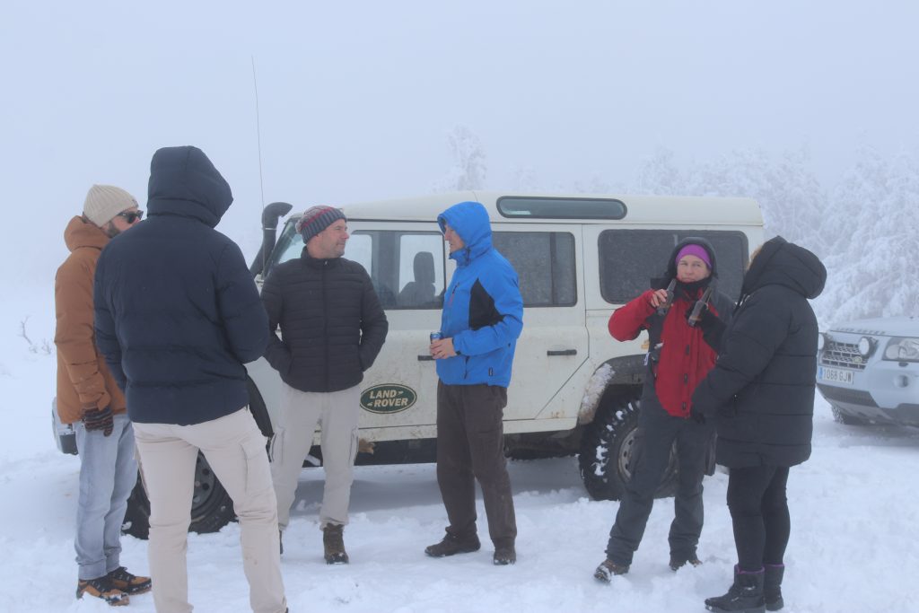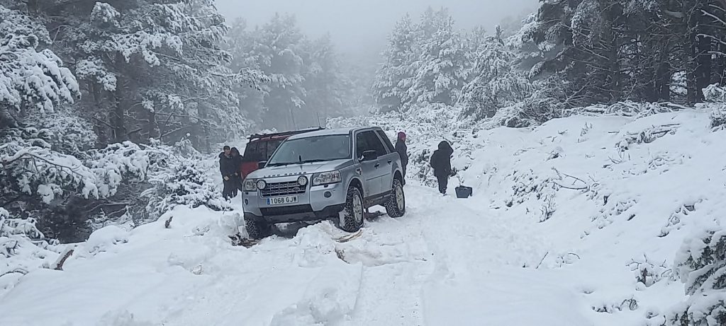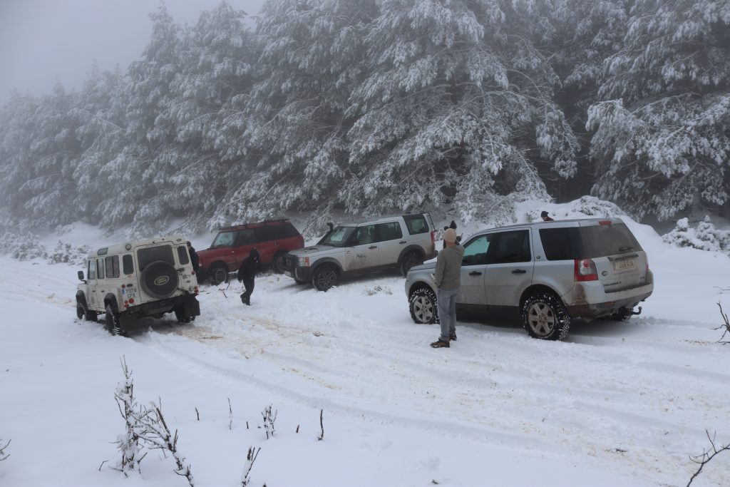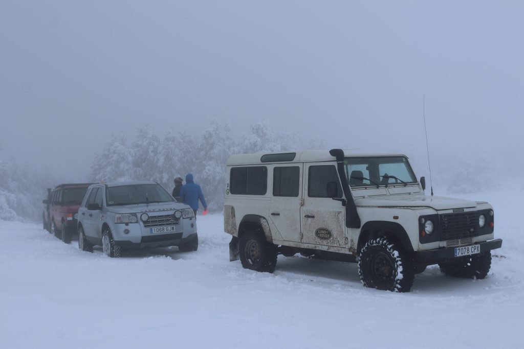 Por carretera nos desplazamos hasta Molinos de Razón para tomar ya las pistas que se internan en la Sierra. Se ve nieve a poca altura y efectivamente, tras el primer cortafuegos, la pista está totalmente cubierta de este regalo de la naturaleza. Abro pista con el Defender, lo cual facilita sin duda alguna la trazada del resto de vehículos que me siguen. Así cualquiera, la verdad. El que va el primero es el más expuesto a quedarse atrapado en la nieve o a sufrir cualquier contratiempo que pueda surgir con estas condiciones climáticas. Pero en el fondo, como guía local, no me queda otra y la realidad es que me gusta.