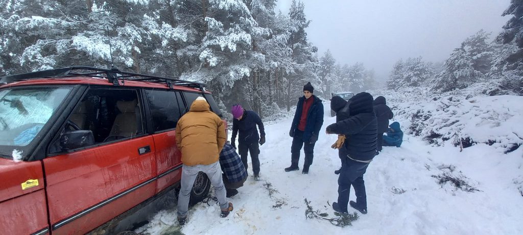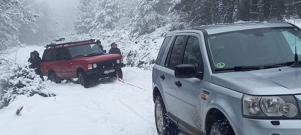 Por la radio informa Chema que su Range Rover ya no sube más pues las ruedas de tacos que calza las lleva algo desgastadas. Paramos la comitiva, nos tiramos bolas de nieve durante un rato mientras el Freelander intenta dar un tirón al Range para que vuelva a la trazada correcta, pero sin conseguirlo.