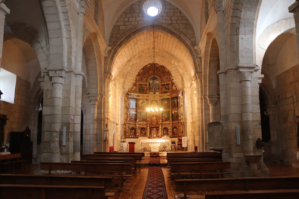 Por supuesto, queremos ver la iglesia, faltaría más. No entraré en detalles, pero el interior es espectacular. Llama la atención el púlpito de una sola pieza de alabastro pulido, así como la pila bautismal y la de agua bendita ambas románicas. Nuestro guía, Lucio, de 83 años, nos cuenta diferentes curiosidades del lugar y habla orgulloso en repetidas ocasiones del joven párroco soriano de 52 años encargado de la iglesia. Lucio, se centra en los retablos, las marcas de los canteros, el altar, los ojos de buey por los que entra luz natural, etc… Todo contado de manera muy natural y resumida, valiéndose de su bastón para señalar lo que él considera más importante.