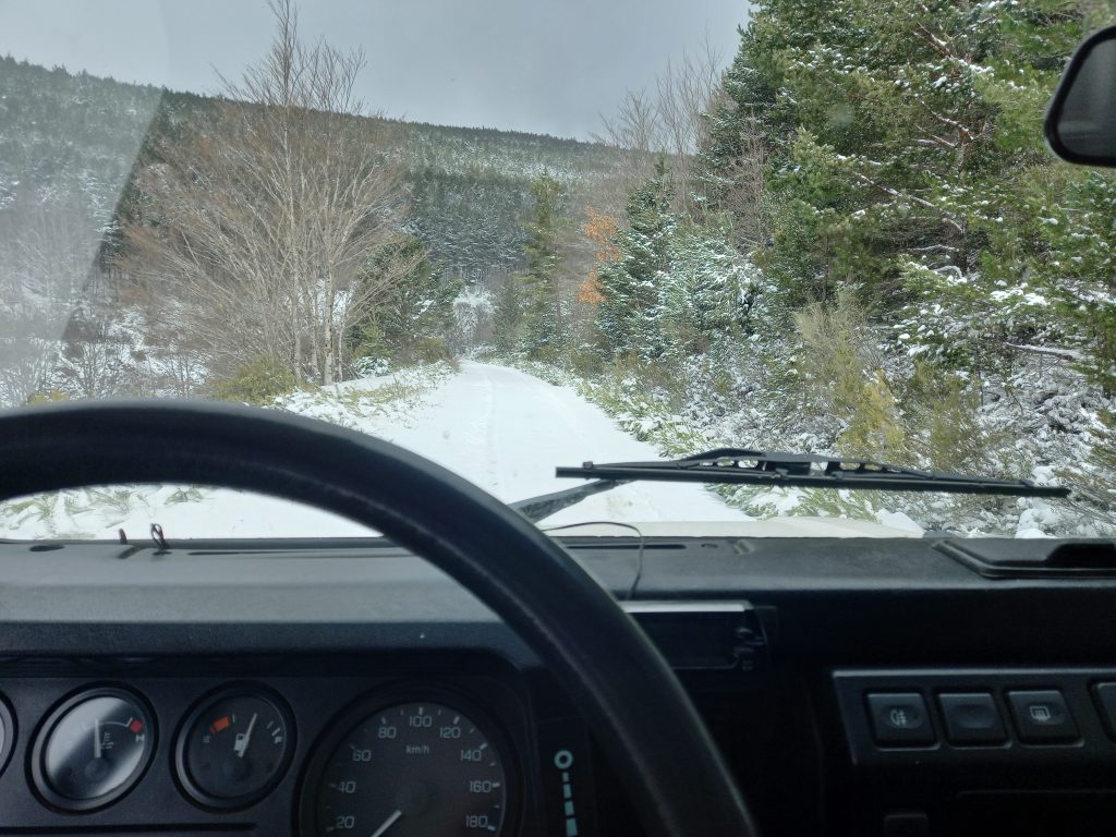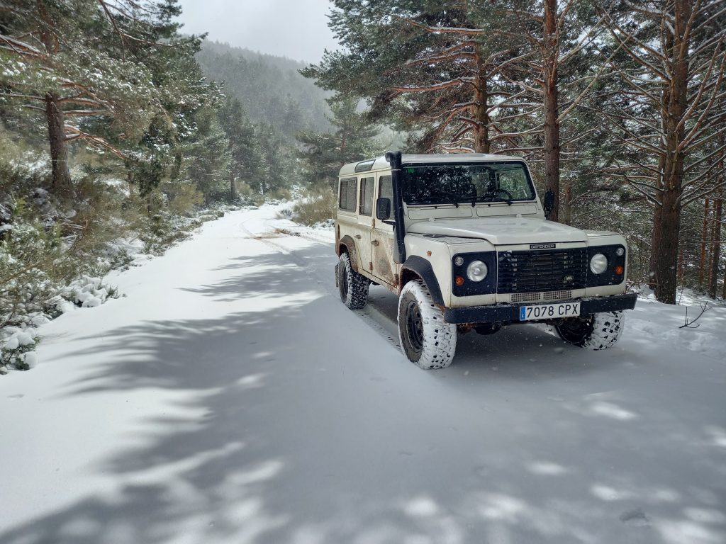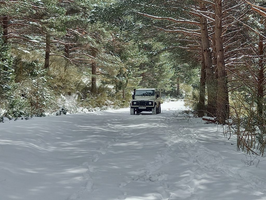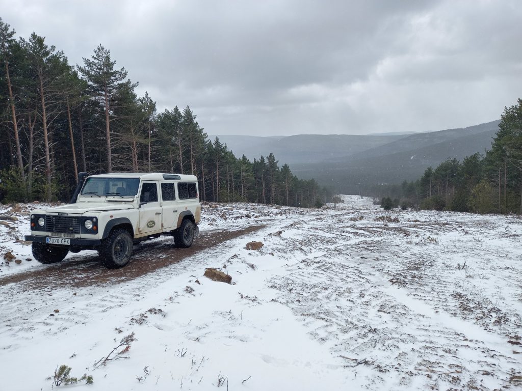 Prosigo mi camino con ganas de aventura y tomo un cortafuegos con fuerte pendiente que me llevará a los 1700 metros de altitud donde cae una fuerte nevada y el potente viento helado se cuela por las múltiples rendijas del Defender. Tras algún paso delicado donde es necesaria la reductora, hago parada para disfrutar del entorno y aprovecho para conservar fuerzas con un buen bocadillo de jamón ibérico recién traído de Extremadura, que elaboro y degusto en el interior del vehículo. El ambiente exterior es muy hostil y sin posibilidad de utilizar de forma cómoda el Land Rover como parapeto por la fuerza del viento y la copiosa nevada.